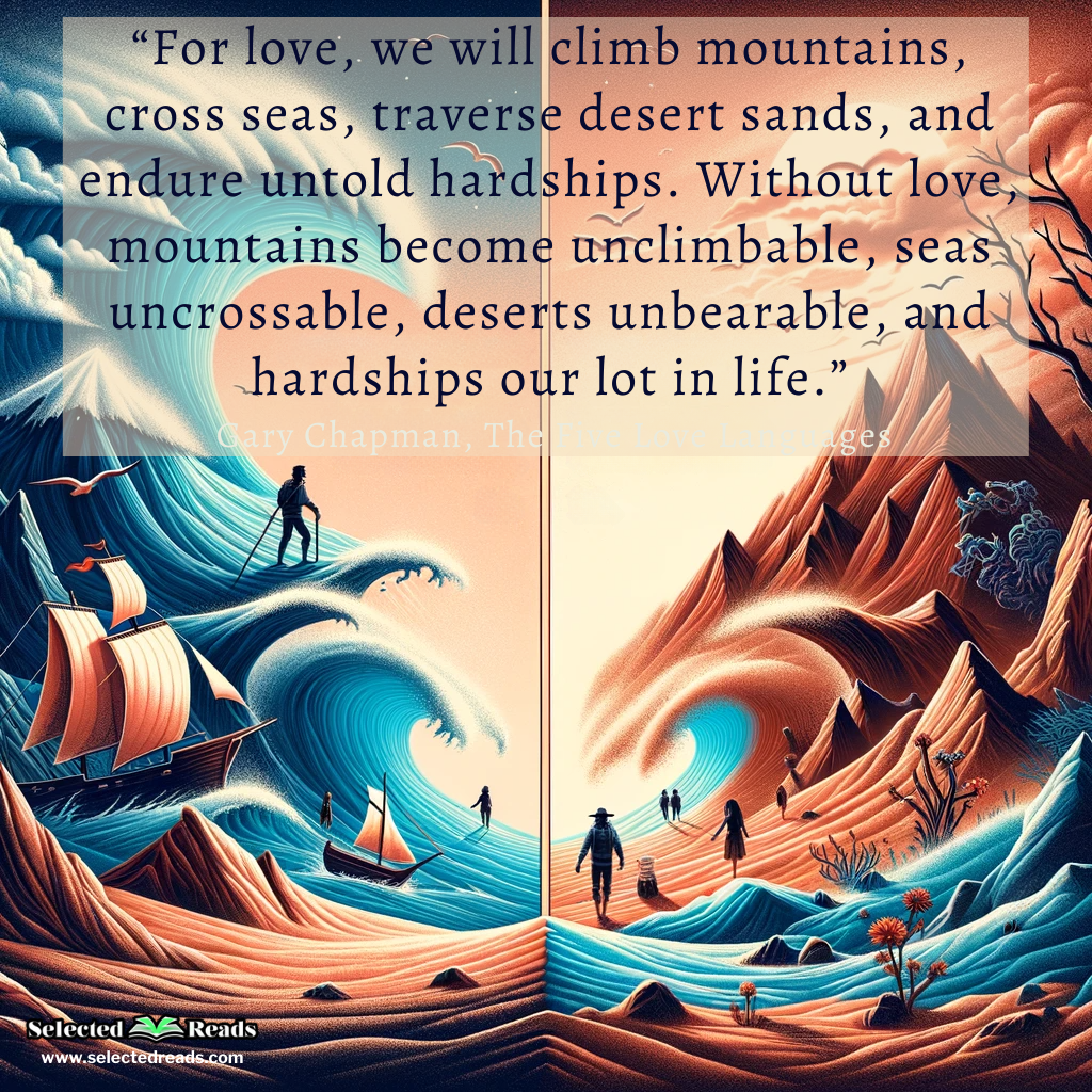 9. “For love, we will climb mountains, cross seas, traverse desert sands, and endure untold hardships. Without love, mountains become unclimbable, seas uncrossable, deserts unbearable, and hardships our lot in life.” ― Gary Chapman, The Five Love Languages